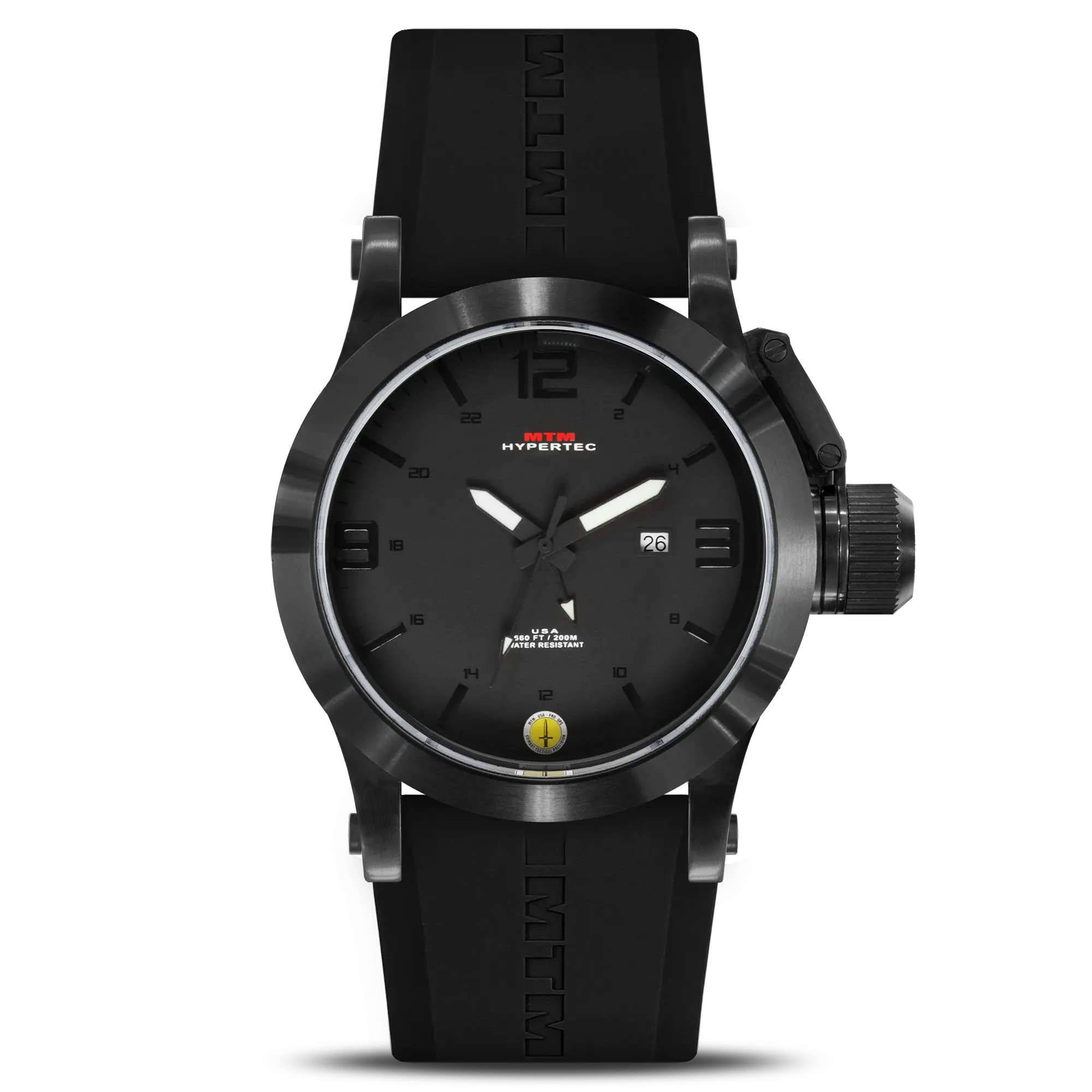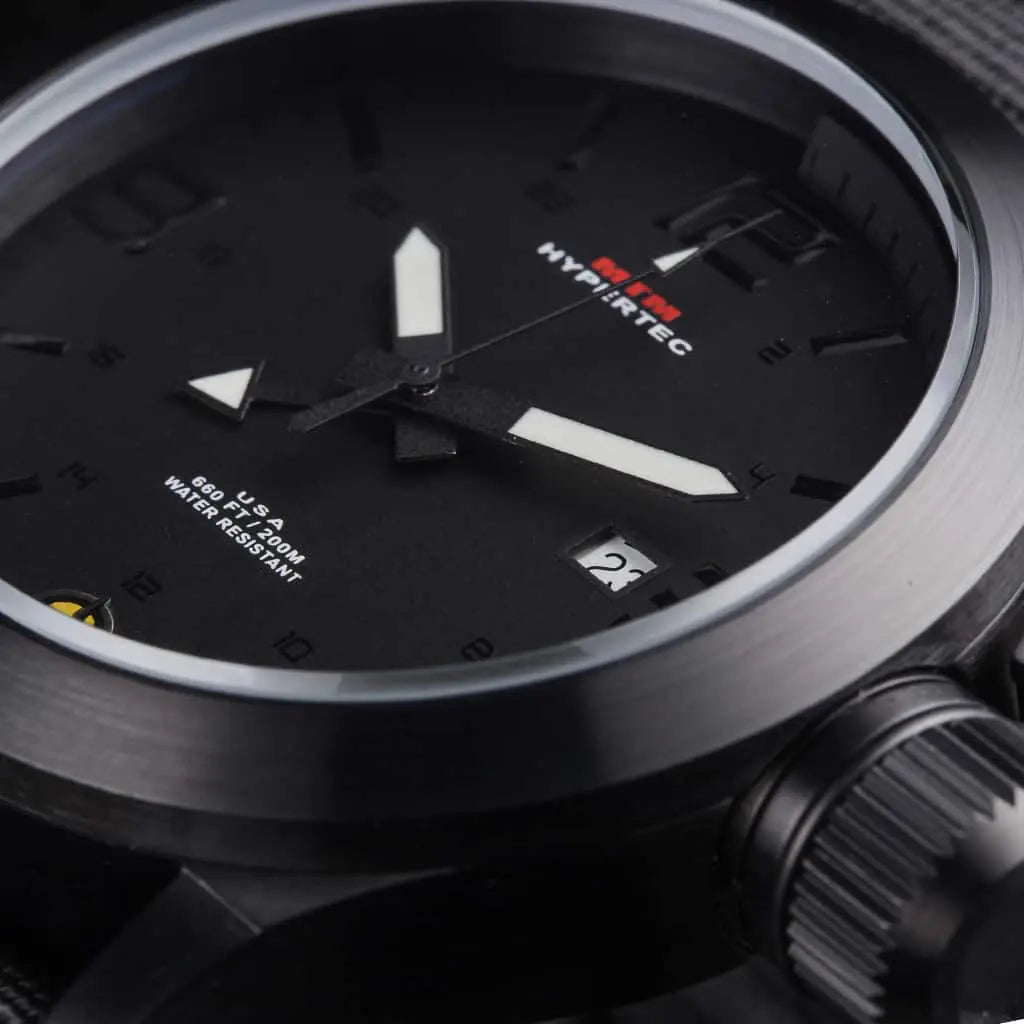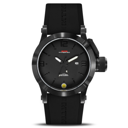 Don’t be fooled by its simplicity in looks and style, the Black Hypertec 40, shown here with a black dial, offers many of the same rugged components of our military-style watches. Precision timing Swiss-made quartz movement ensures this watch will last for many years to come. For watersports, this watch can resist depths up to 660 feet/200 meters, and at night, its super luminous hands glow, allowing for easy readability of the time. A date window and 24-hour indicator are both featured in the dial, which is securely enclosed by tempered glass. Watch enthusiasts will have many options to choose from, such as case size, case color, dial color, and more.