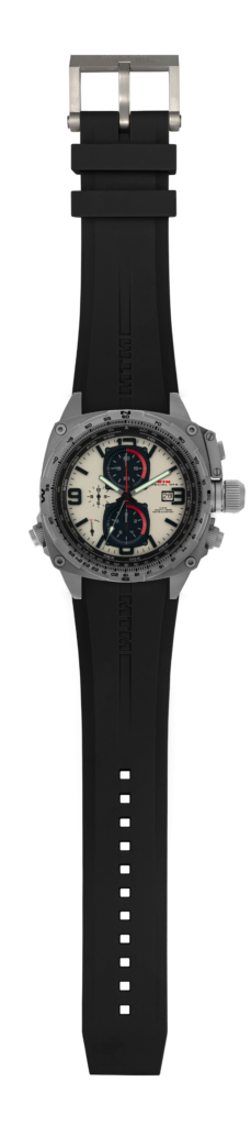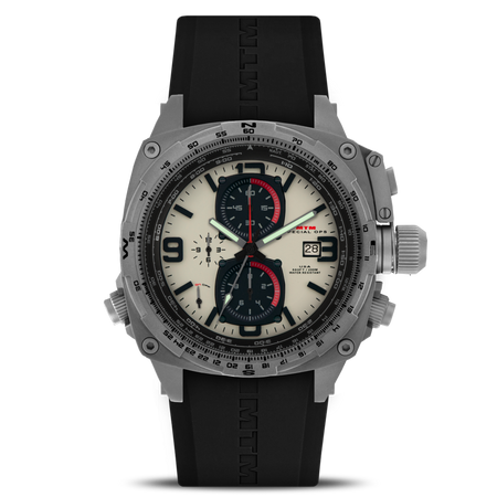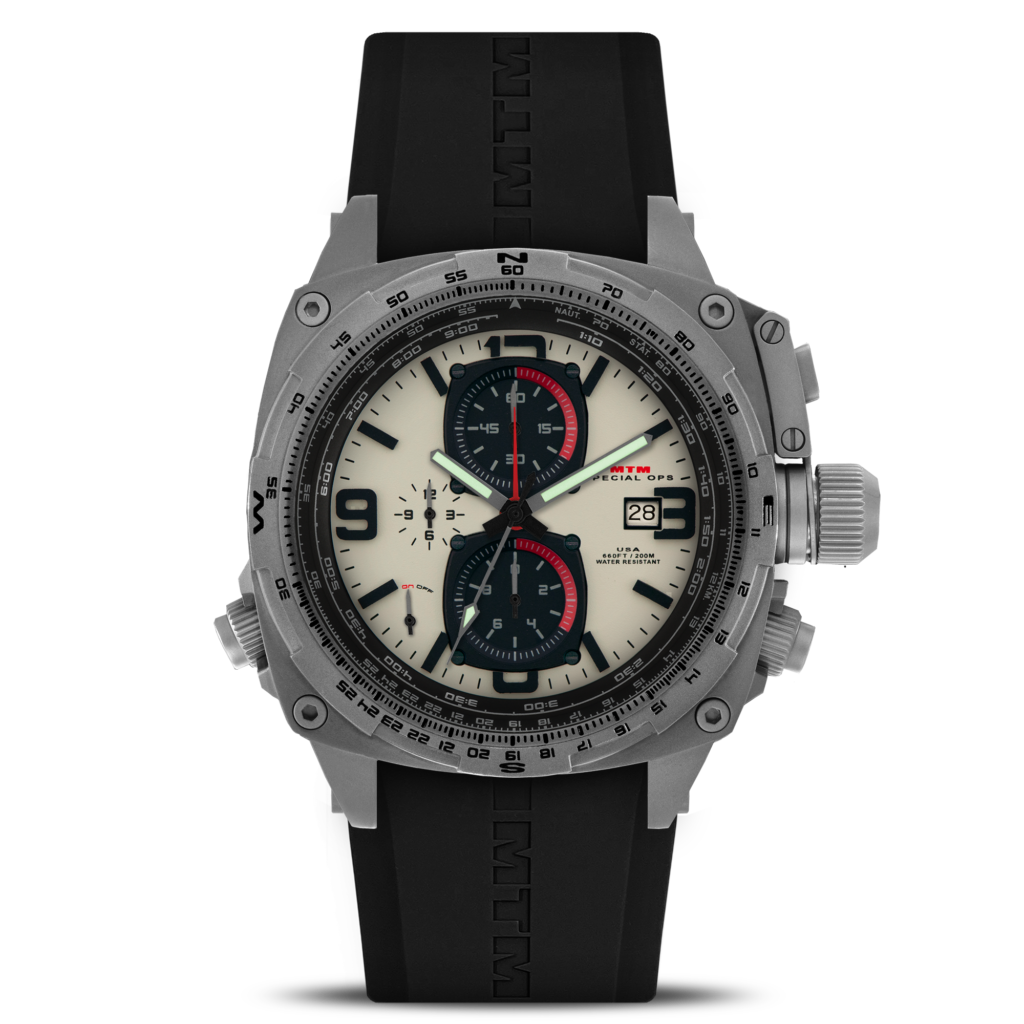The limited edition MTM Grey Cobra 44 with tan-black dial and black rubber strap. Our premier chronograph tactical watch for men, incorporates a classic slide rule bezel with state-of-the-art Titanium to create a contemporary and cutting-edge pilot watch for men.